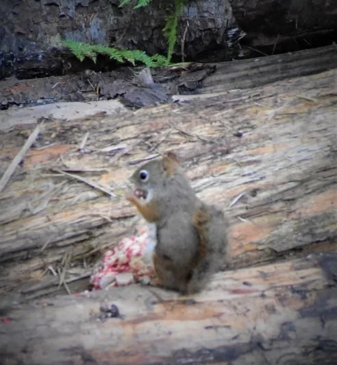 No bears, no deer, no raccoons, no nuttin! Except for a wild howling pack of coyotes. Beautiful. Hadn't thought about that ... great! Turned and reached back for his hand, was assured they cannot and will not climb a tree to maul me. AND THEN there was this damn red squirrel. Every noise, every turn of a leaf, I just knew it was something coming to kill me. Then I hear a frantic chipping chirping like a monkey in heat ...the damn red squirrel!! It was four trees away, same height as me, its tail was flipping. "Hey," Doug whispered. "That's a red squirrel, you're going to want to listen to nature, it will tell you when something is happening, watch where it's pointed, and you'll see why it's in attack mode!" I freshly, but lovingly and quietly replied, "I know it's a red squirrel. I can't help but hear its primal scream. It is pointed at me and started seven trees out but keeps jumping a tree closer. It wants to attack ME!"